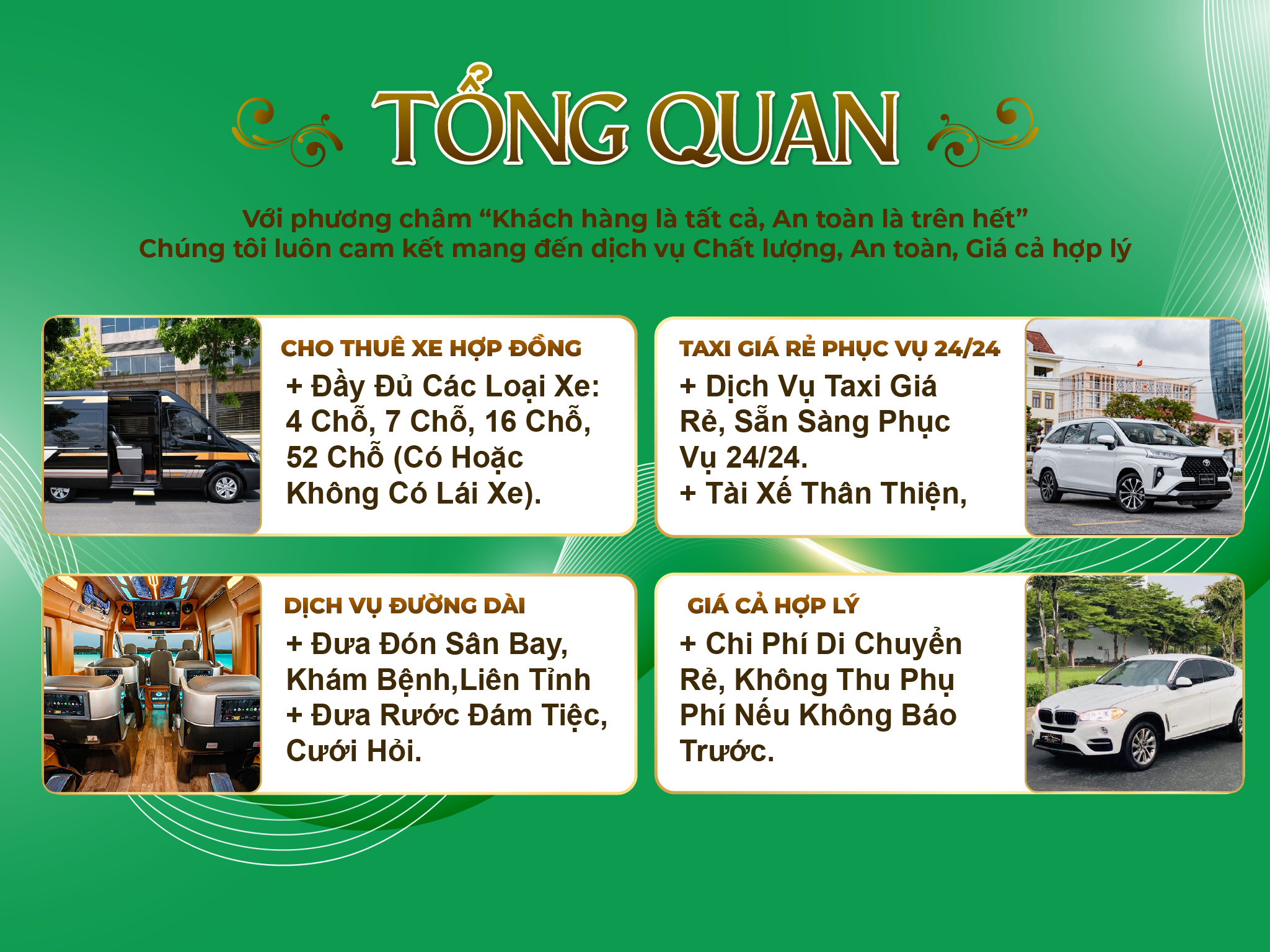Hỗ trợ đặt xe online qua website/app, thanh toán tiền mặt hoặc chuyển khoản.